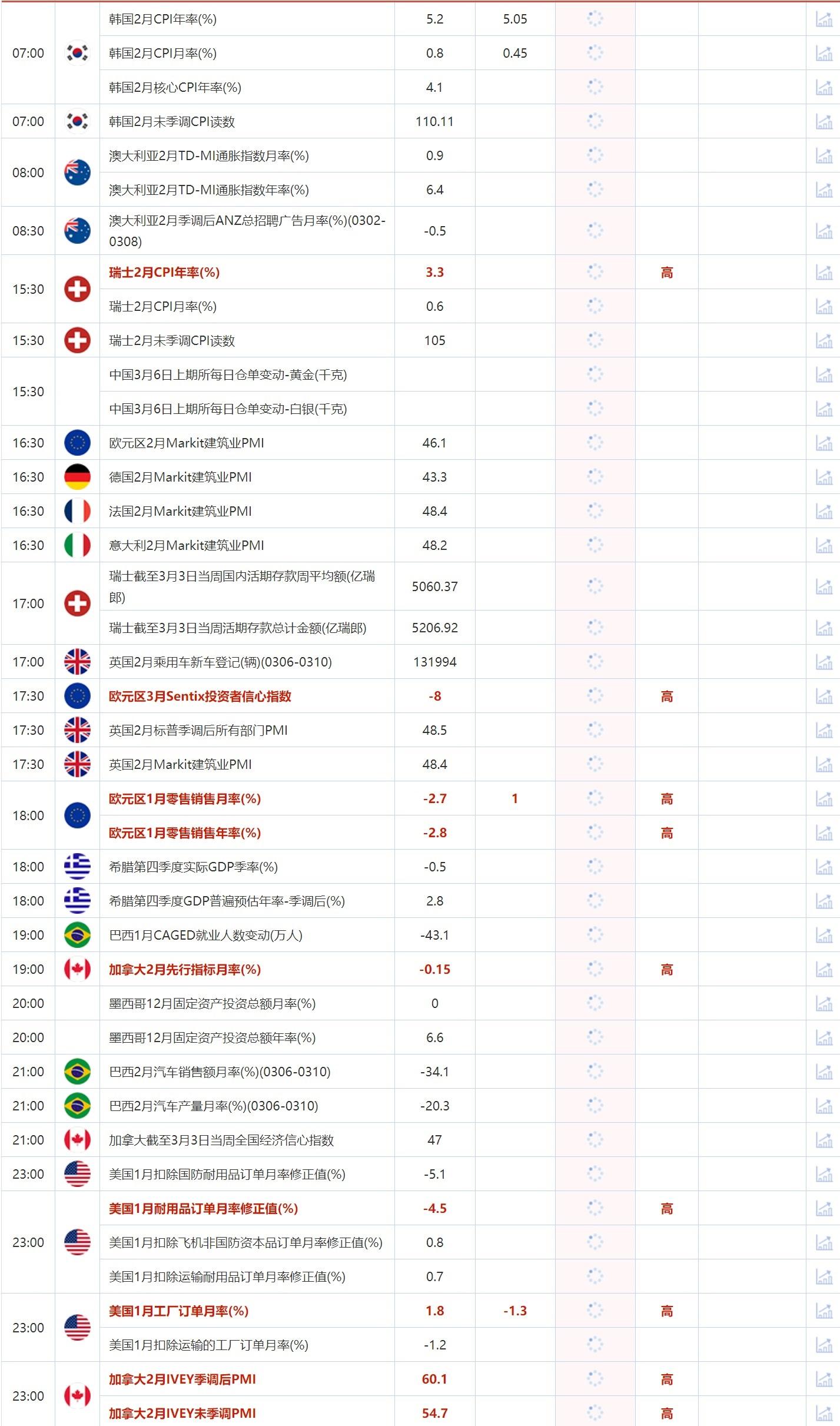 15:30 瑞士2月CPI年率(%) , 前值 3.3 , 预期值 -- , 公布值:待发布