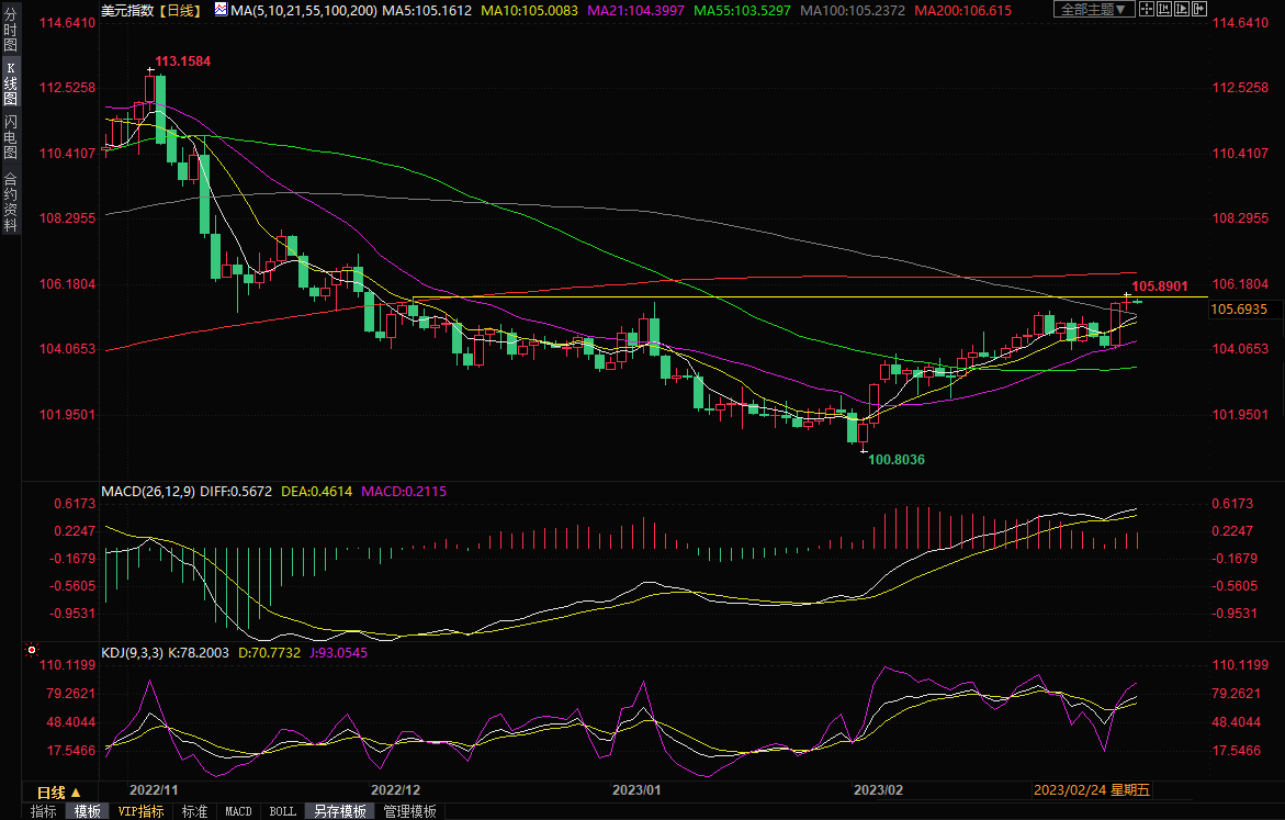 美元指数周三尾盘持平于105.63,早些时候达到105.89,为12月1日以来最高。它从2月1日的九个月低点100.80上升,但仍远低于9月28日达到的20年高点114.78。