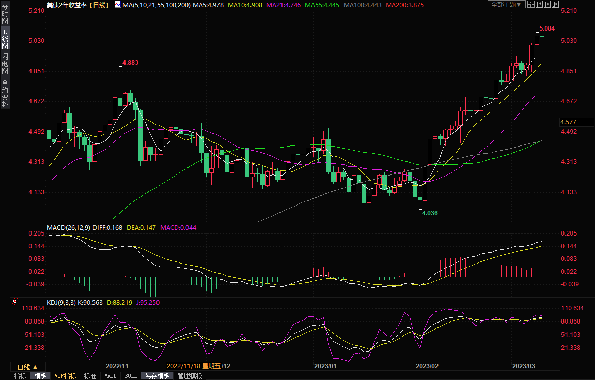 在鲍威尔发言后,较短期公债收益率在周二跳涨,在周三继续上涨,2年期国债收益率一度触及5.084%的2007年6月15日以来最高,收盘上涨1.1%,收报5.066%。