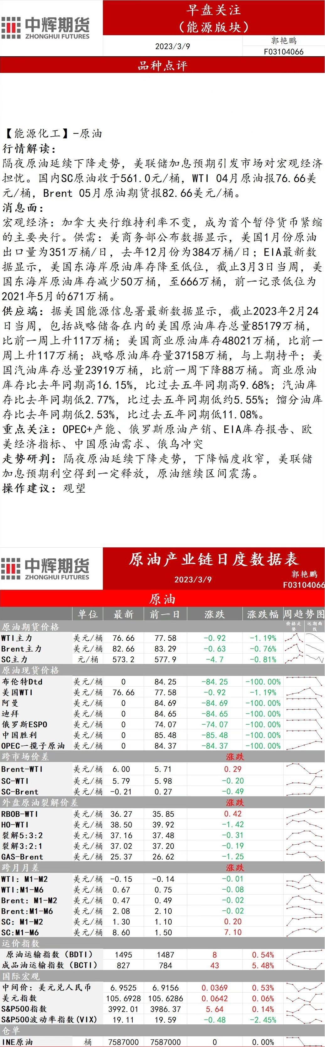 汇通财经APP讯——3月9日,中辉期货发布能源早盘关注,称美联储加息预期利空得到一定释放,原油继续区间震荡,建议观望。中辉期货公司授权文本由“专注期货开户交易及专业行情分析资讯网站”:【一期货 www.1qh.cn】转发
