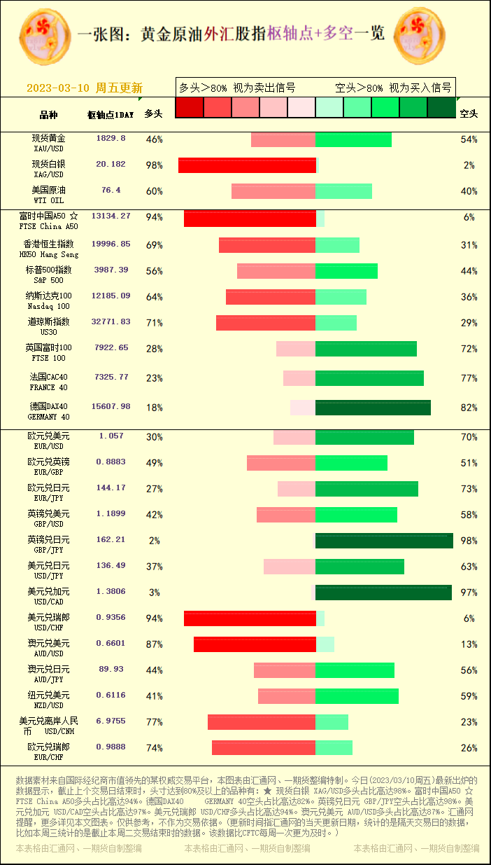 标题:一张图:黄金原油外汇股指"枢纽点+多空占比"一览(2023/03/10周五)