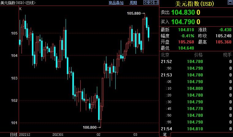 汇通财经APP讯——现货黄金本周重新走低,一度逼近上周创下的去年12月下旬以来新低1804.63美元/盎司,美元指数创去年12月初以来新高至105.890,因美联储主席鲍威尔本周暗示不排除重新加速升息。