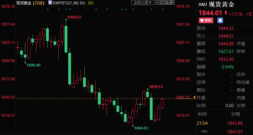 截至发稿,现货黄金下跌0.63%至1843.52美元/盎司;美元指数上浮0.18%至104.721。