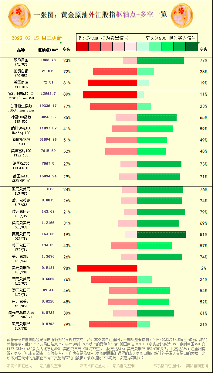 标题:一张图:黄金原油外汇股指"枢纽点+多空占比"一览(2023/03/15周三)