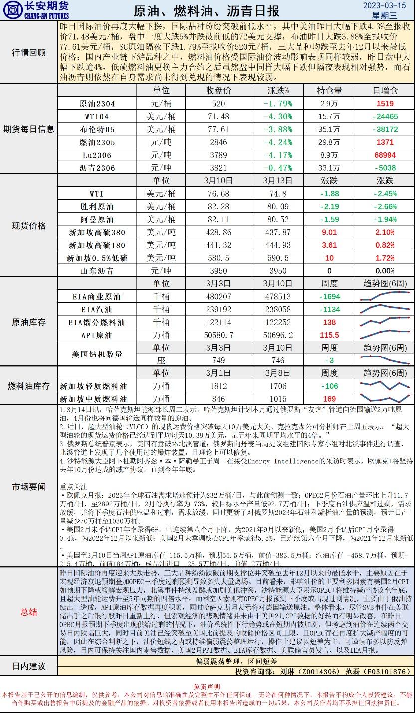 汇通财经APP讯——3月15日,长安期货发布原油早评,油价跳水跌破72美元大关,偏弱运行下或存反弹风险,建议区间短差操作。 长安期货公司授权文本由“专注期货开户交易及专业行情分析资讯网站”:【一期货 www.1qh.cn】转发