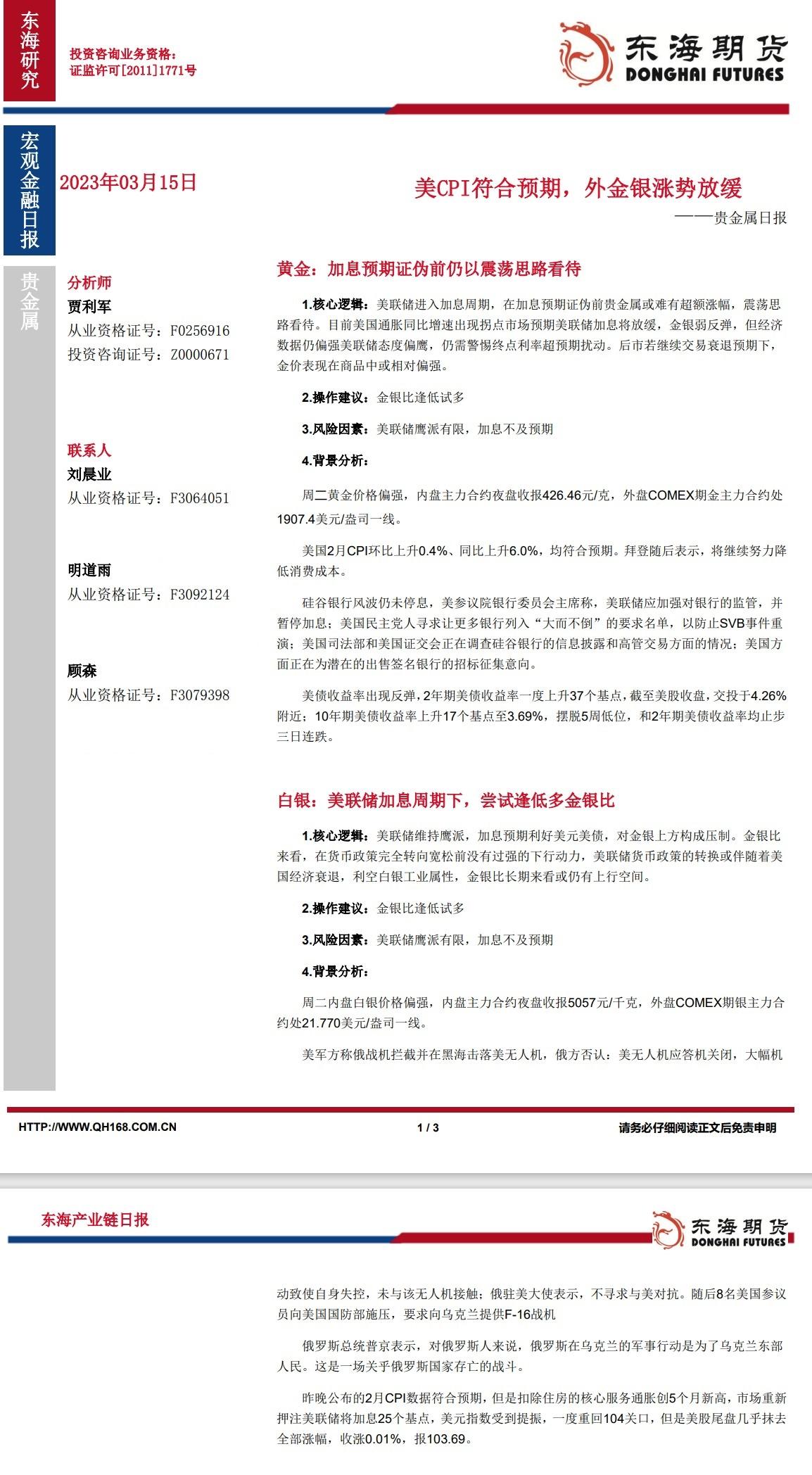 标题:【东海期货3月15日产业链日报】贵金属篇:美CPI符合预期,外金银涨势放缓
