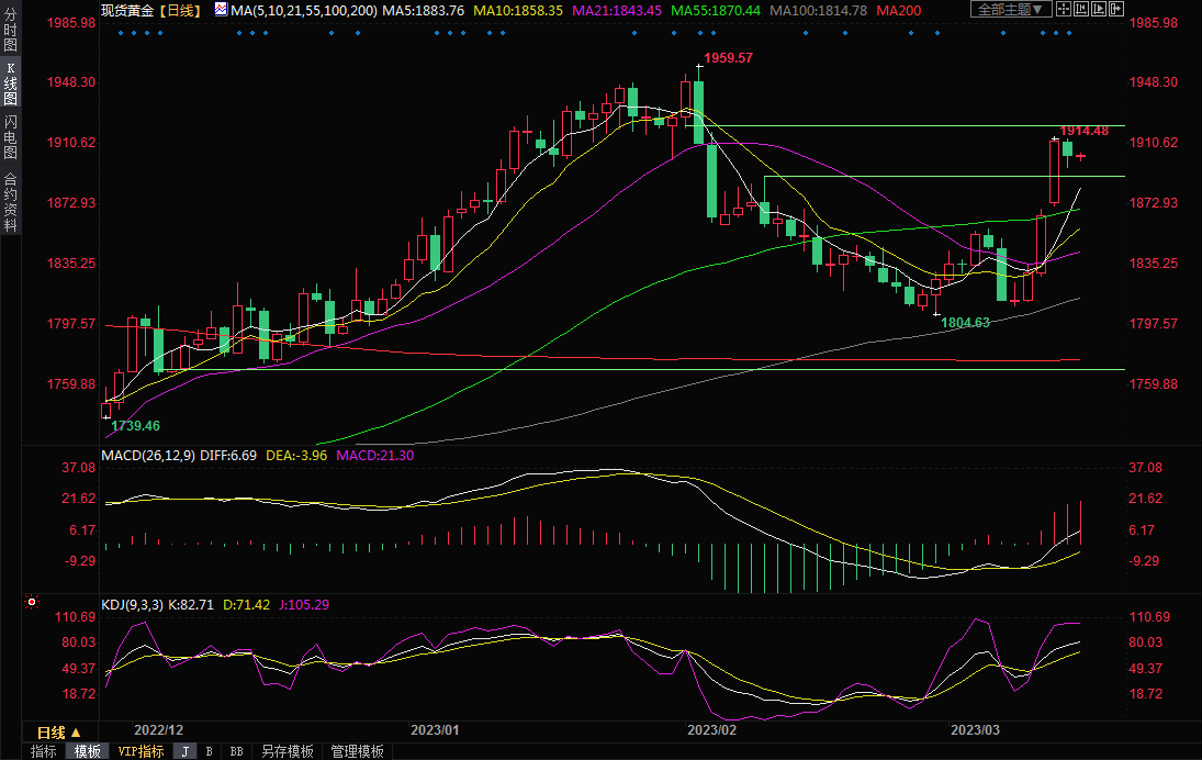整体来看,虽然通胀压力依然较大,美联储下周大概率会加息25个基点,美债收益率反弹,令金价涨势暂歇。但很明显,预计在硅谷银行倒闭后市,美联储不会太过于鹰派,市场对终端利率的预期明显下调,年内降息的可能性也也有所增加,再加上地缘局势紧张,预计金价后市仍有进一步震荡走高的机会。北京时间10:19,