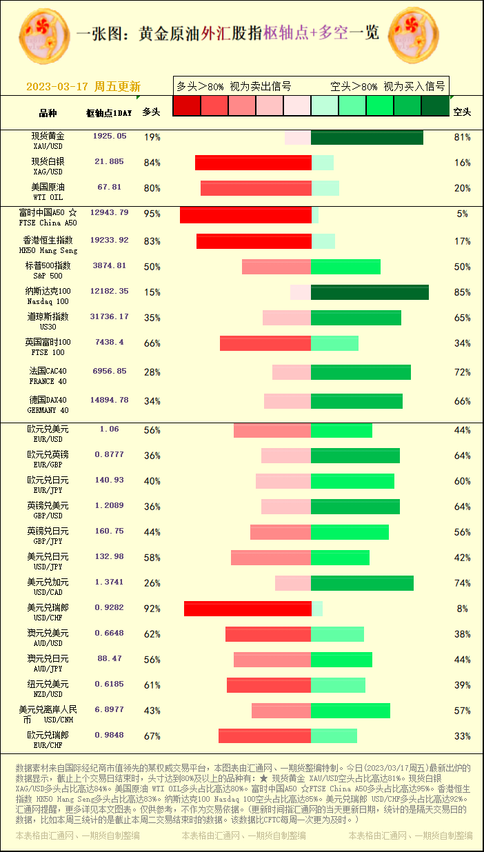 标题:一张图:黄金原油外汇股指"枢纽点+多空占比"一览(2023/03/17周五)