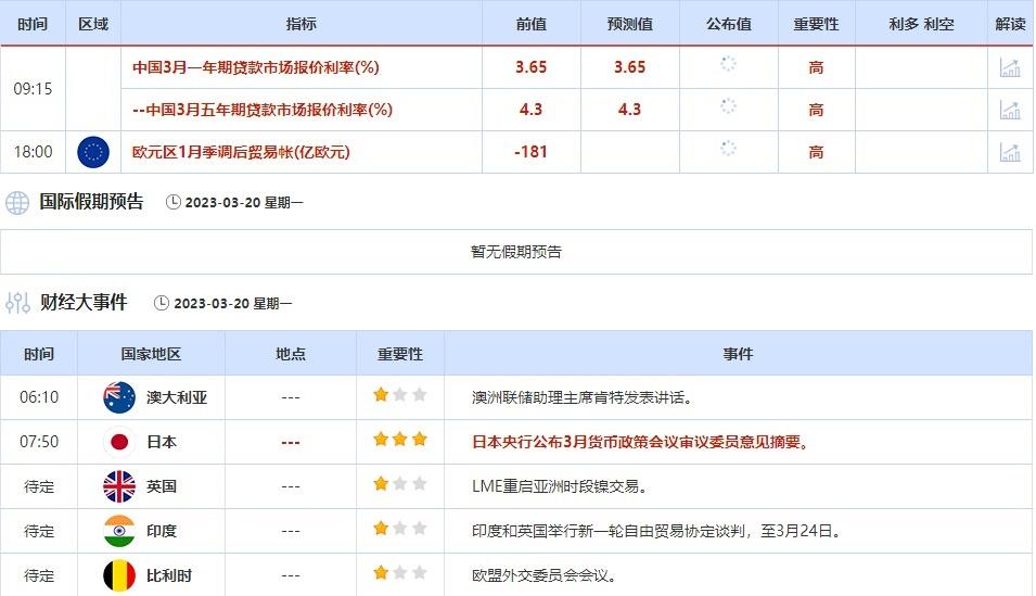 ①3月20日(周一)关键字:欧元区1月季调后贸易帐,日本央行3月货币政策会议审议委员意见摘要