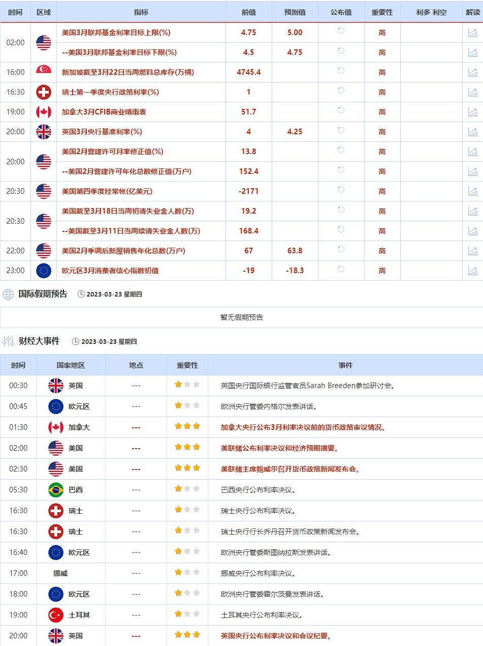 3月23日,投资者重点关注美联储和英国央行的利率决议。中信证券指出,硅谷银行倒闭事件的风险蔓延暂告段落,预计美联储将在3月加息25个基点而非50个基点,降息仍未可期。