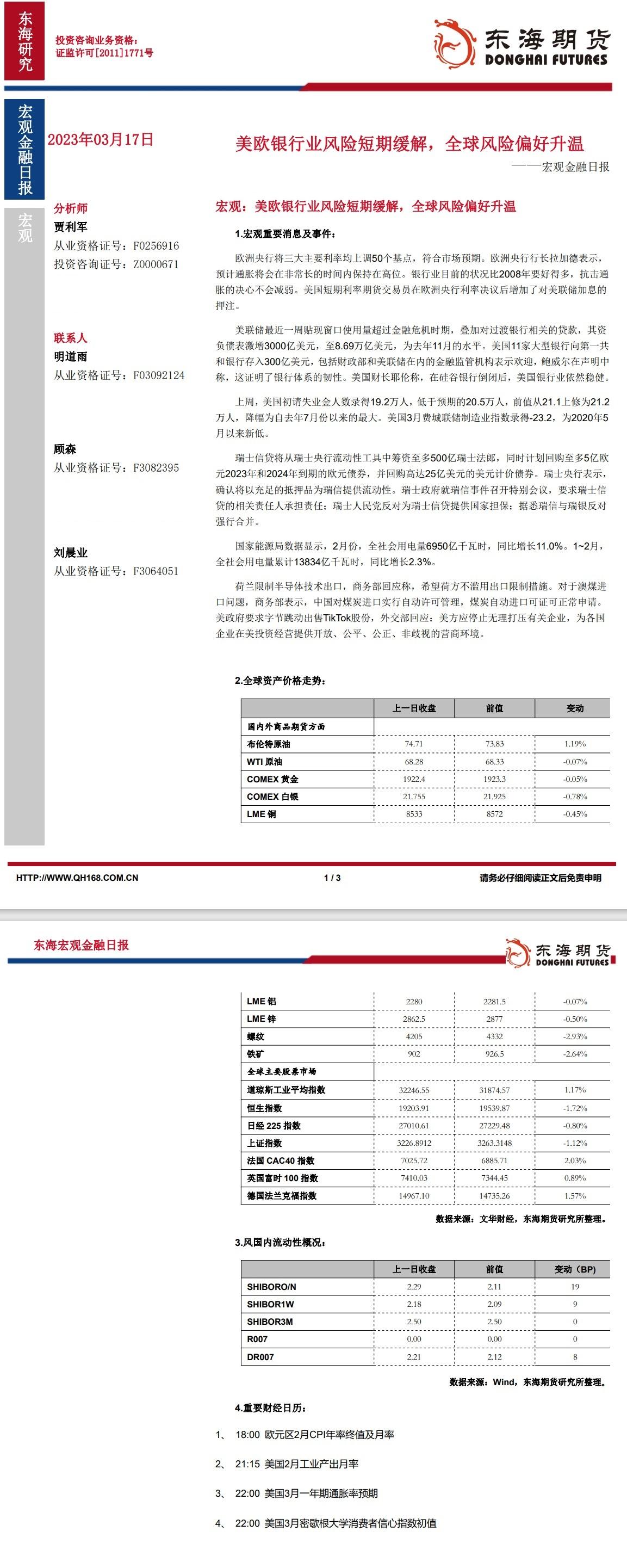 标题:【东海期货3月17日宏观金融日报】:美欧银行业风险短期缓解,全球风险偏好升温