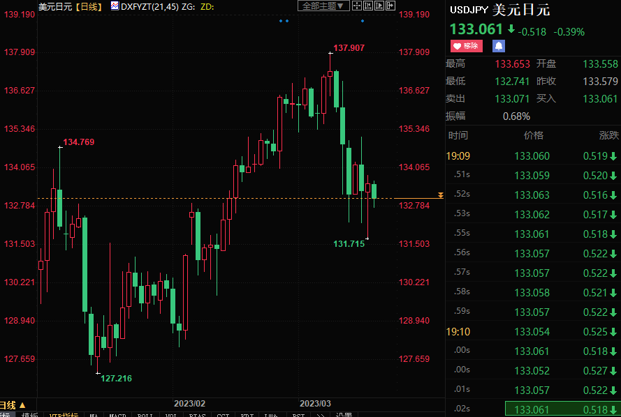 美元兑日元下跌近1.5%,盘中创2月14日以来新低至131.700。