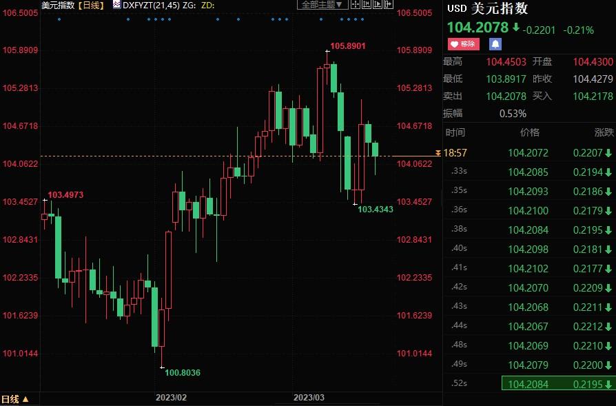 美元指数下跌0.34%至104.27,盘中创2月15日以来新低至103.44。