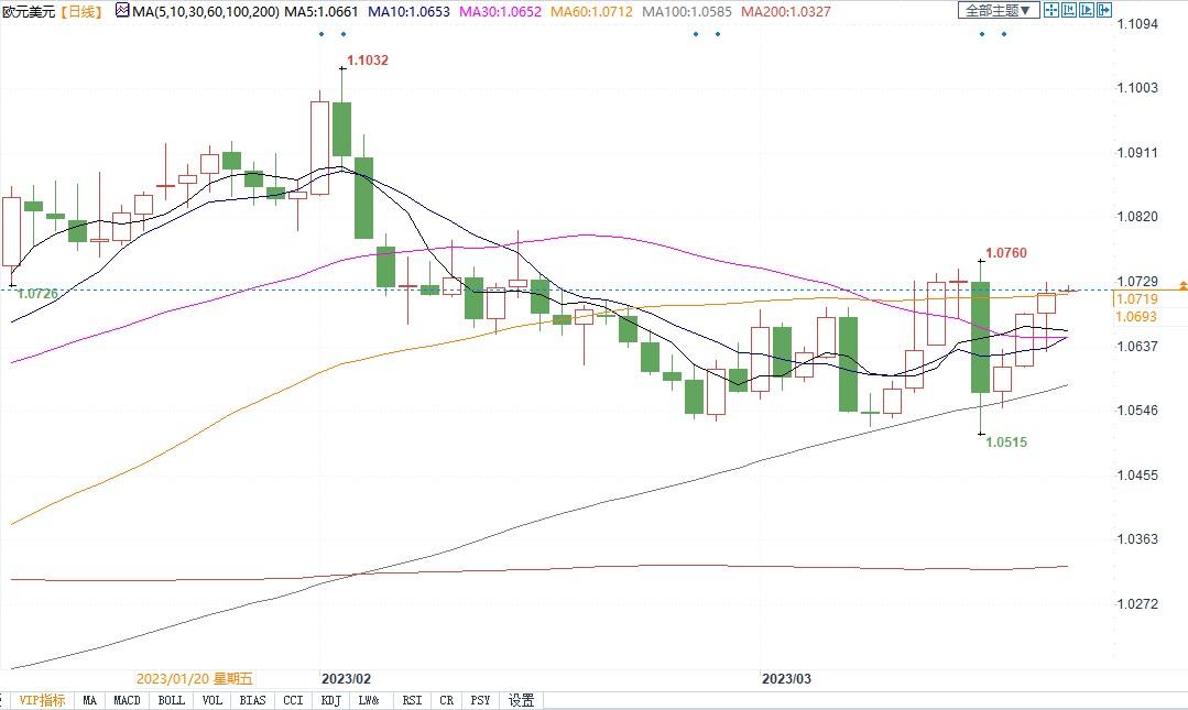 欧元兑美元突破区间上行,但欧元区经济前景因银行业危机遭到拖累,高盛下调欧元区经济增长预期,还下调欧洲央行的加息预期,恐限制