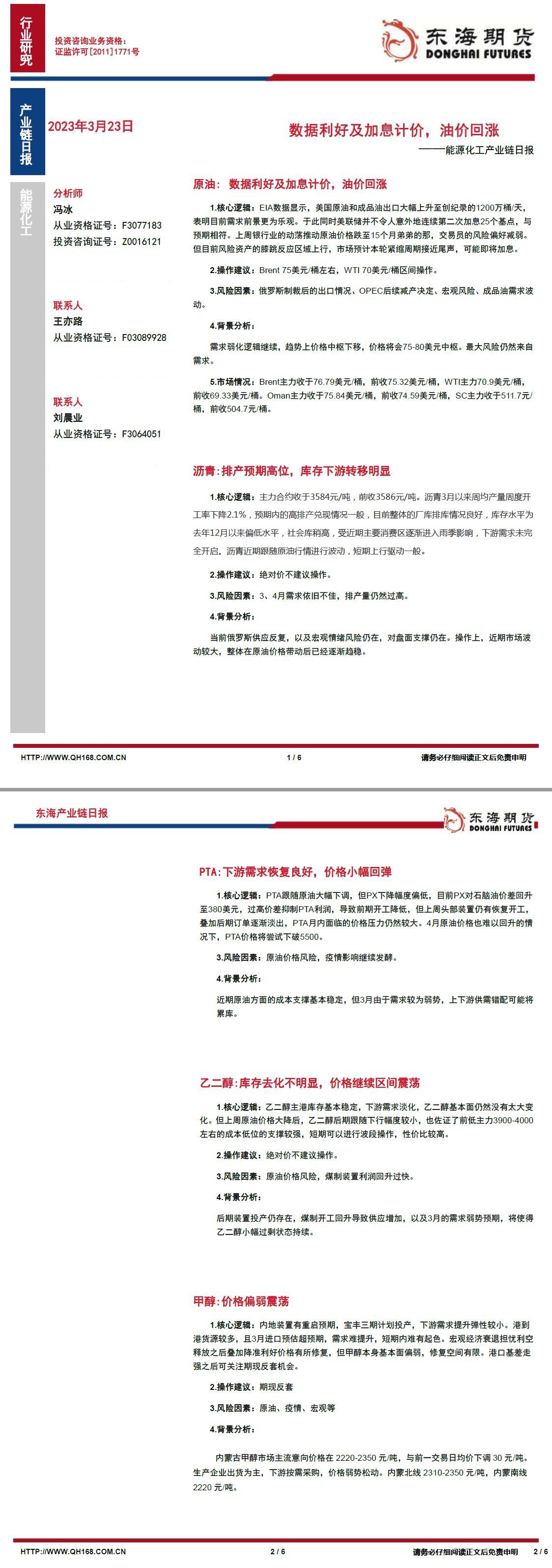 标题:【东海期货3月23日产业链日报】能化篇:数据利好及加息计价,油价回涨