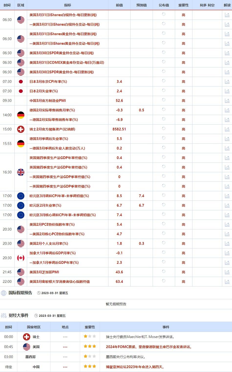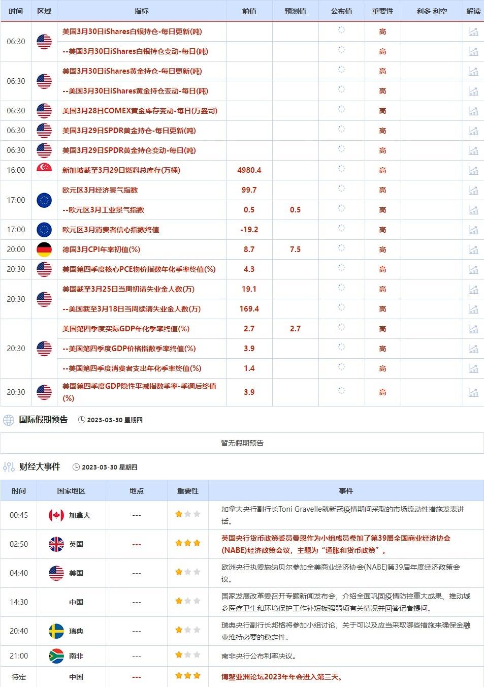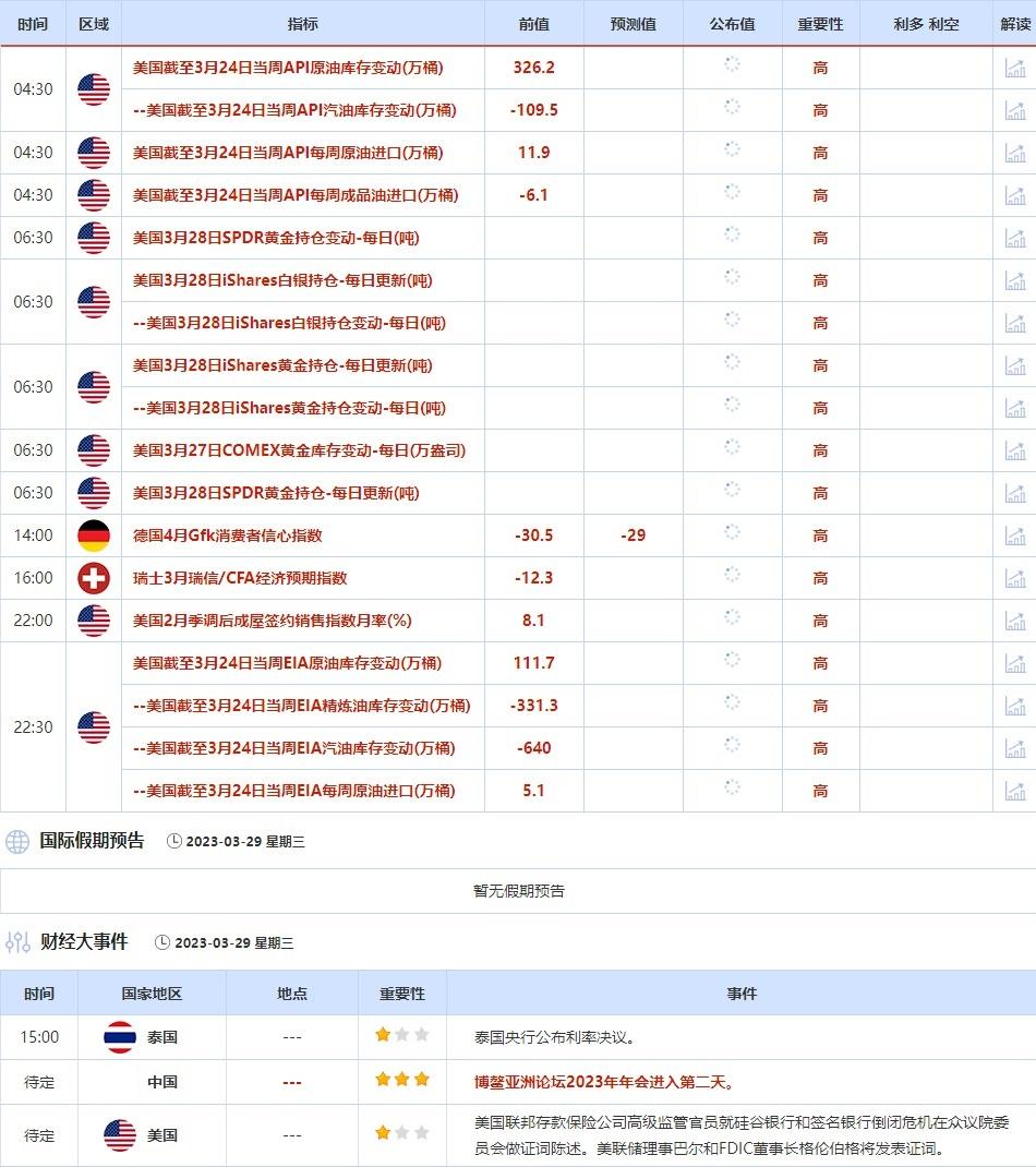 3月28日,英国央行行长贝利在伦敦经济学院发表讲话,投资者需关注他的最新观点。此外,当天美国参议院银行委员会就硅谷银行事件举行听证会,也需引起投资者注意。
