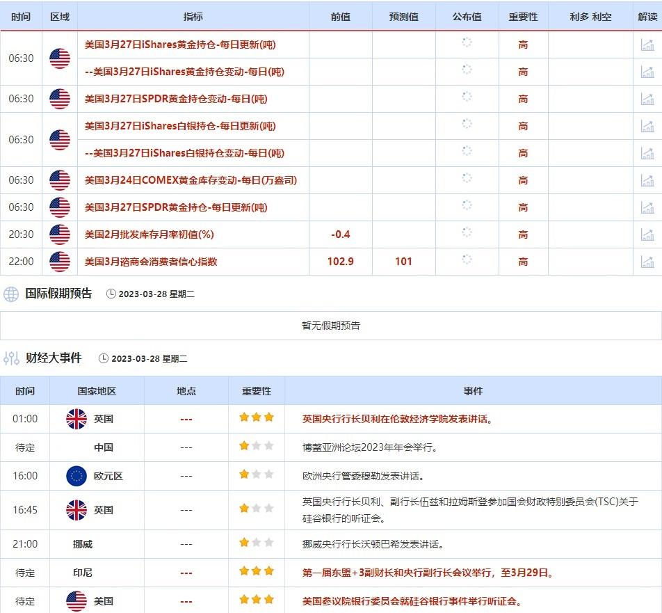②3月28日(周二)关键字:美国2月批发库存月率初值,英国央行行长贝利,硅谷银行事件听证会