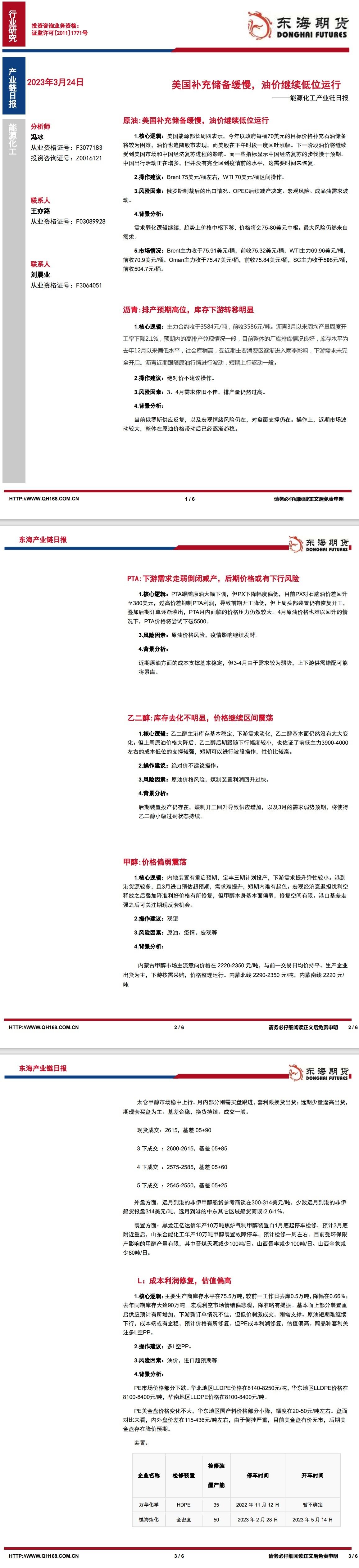 标题:【东海期货3月24日产业链日报】能化篇:美国补充储备缓慢,油价继续低位运行
