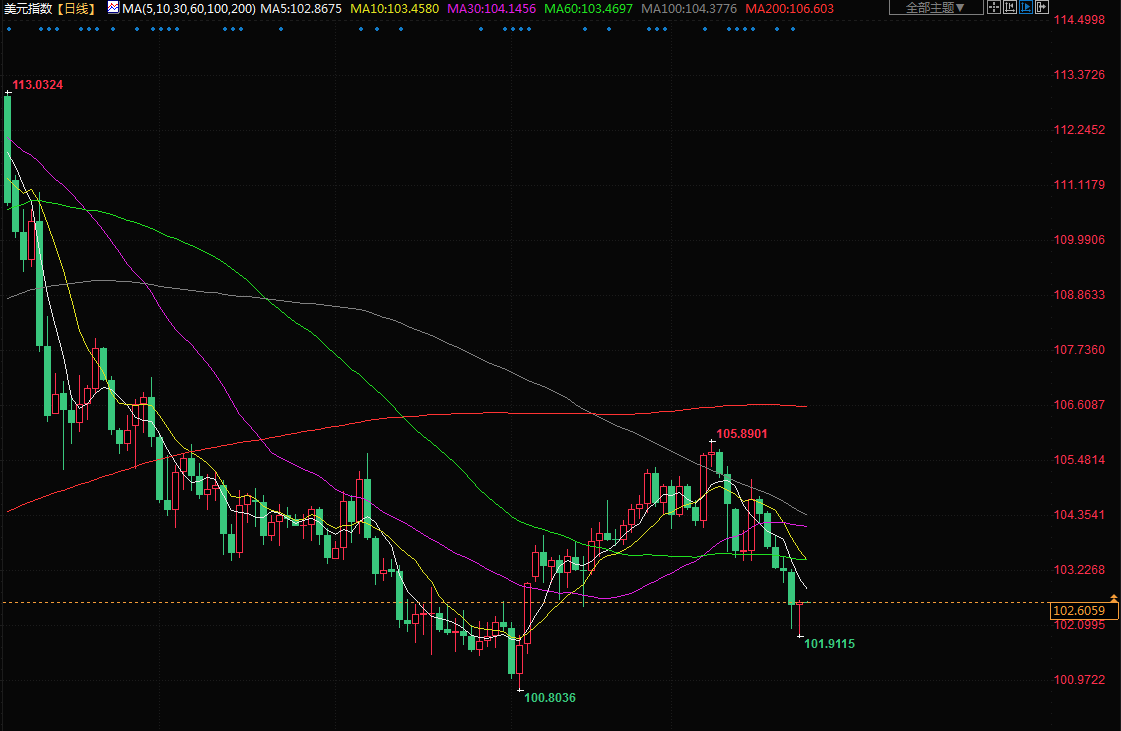 美元指数触及2月3日以来最低,一天前美联储暗示已接近暂停加息;美联储决策者认为,打退通胀可能只需要在今年再加一次息,但明年放松政策的程度要比他们中的大多数在三个月前预期的低。
