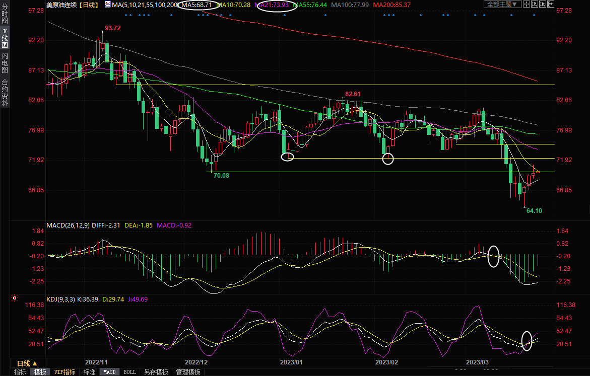日线级别:单边下跌后反弹;MACD死叉,油价连续两个交易日反弹受阻,并留下较长的上影线,暗示上方阻力较强,需要地方油价重回跌势的可能性,初步支撑在5日均线69.29附近,周二低点支撑在66.89附近,若失守该支撑,则增加后市看空信号;进一步支撑参考3月15日低点65.67和近期低点64.10位置。