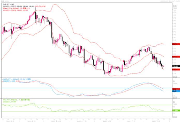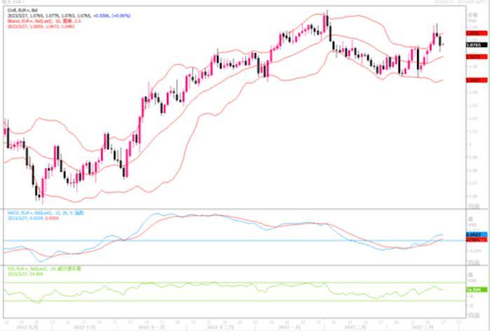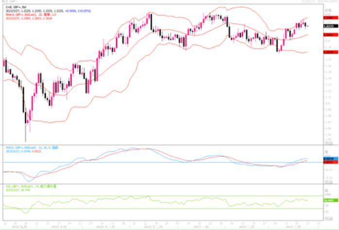 上周五(3月24日)欧元兑美元下跌0.71%,报1.0753。欧洲银行股大跌,银行业巨头德意志银行和瑞银集团急挫,因担心自2008年金融危机以来该行业遭遇的最严重问题尚未得到遏制。银行危机问题拖累欧元兑美元产生急速的下滑走势。市场预测,在金融冲击没有极端恶化的情况下,欧洲央行加息抗击通胀之路就尚未到尽头之时。因此在息差这项因素上,欧元或还可得到相应一定程度上的支撑。日线图上,欧元兑美元尚能保持在布林带中轨之上,技术指标亦未显现拐头转向痕迹。近期若能保持在1.07之上震荡整理,后市或可有望延续上行态势。