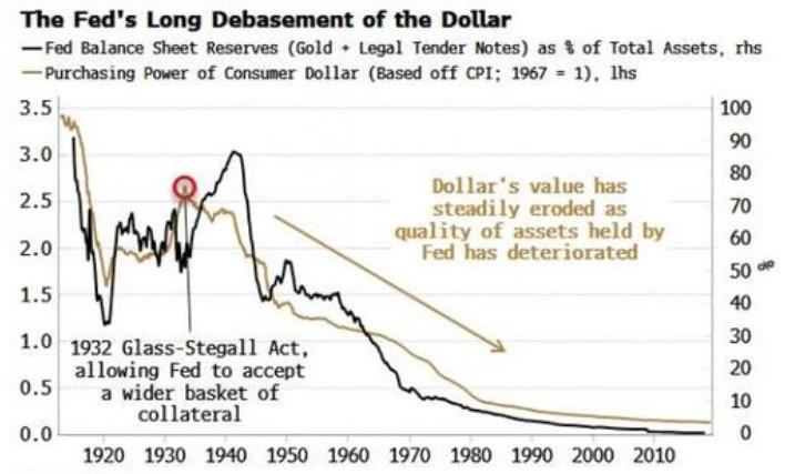 美联储资产负债表的恶化(以优质资产所占比例衡量)与美元的实际价值(即购买力)之间几乎存在1:1的关系。