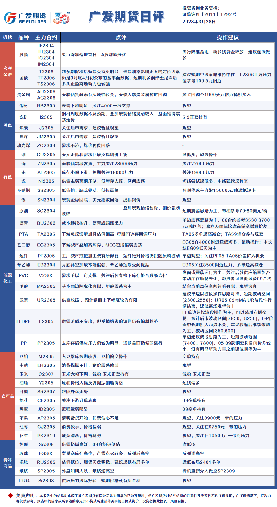 汇通财经APP讯——广发期货发布3月28日日评,建议黄金回调至1900美元附近择机买入,铁矿5-9正套持有;铜逢低多,短线操作;原油短期震荡思路为主,布油参考70-80美元;豆粕空单持有,油脂短线偏多,纯碱逢低做多。