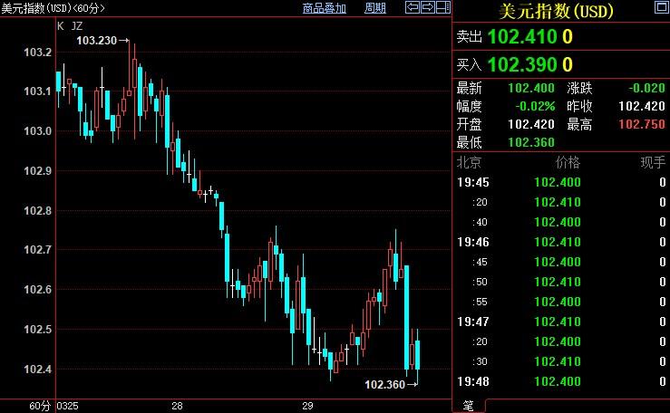 北京时间19:47,现货黄金下跌0.47%至1964.14美元/盎司;COMEX期金主力合约下跌0.39%至1965.8美元/盎司;美元指数下沉0.02%至102.408。