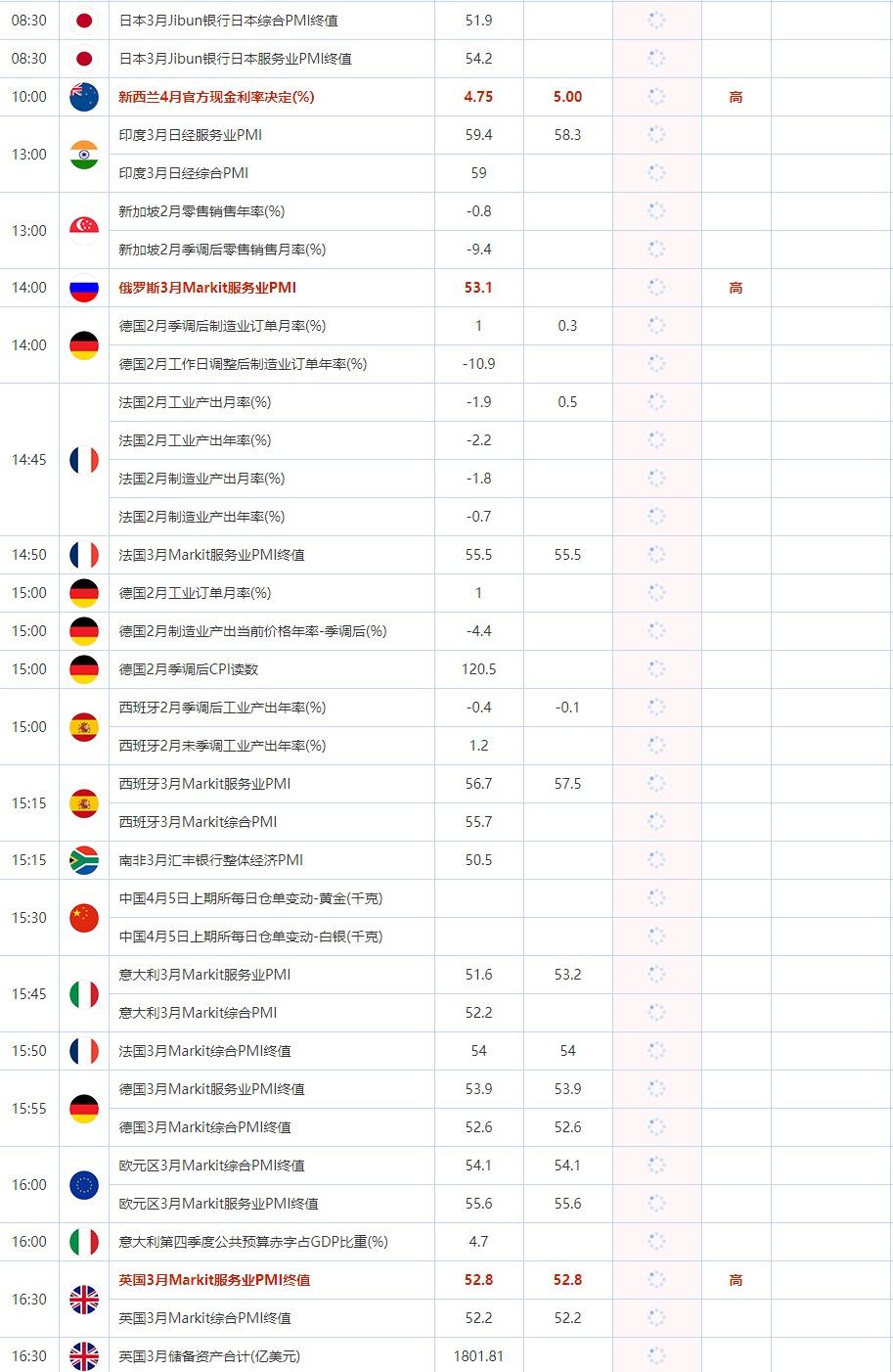 10:00 新西兰4月官方现金利率决定(%) , 前值 4.75 , 预期值 5 , 公布值:待发布