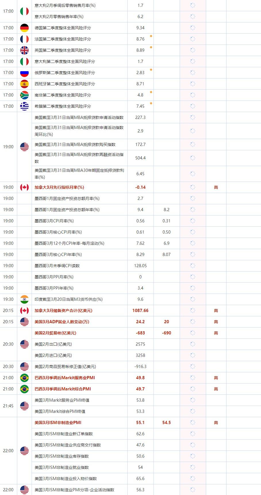 22:00 美国3月ISM非制造业PMI , 前值 55.1 , 预期值 54.5 , 公布值:待发布