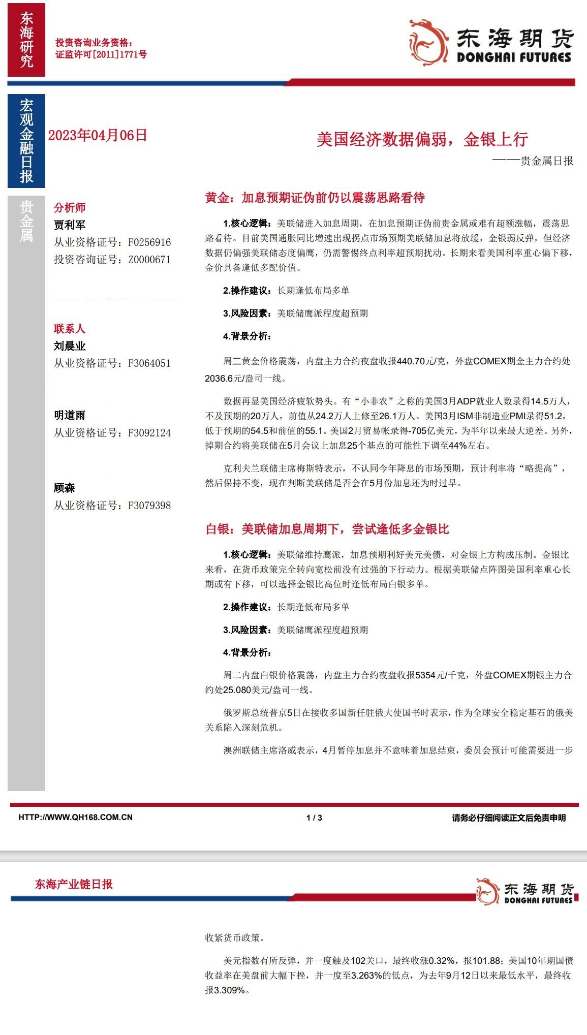 标题:【东海期货4月6日产业链日报】贵金属篇:美国经济数据偏弱,支撑金价