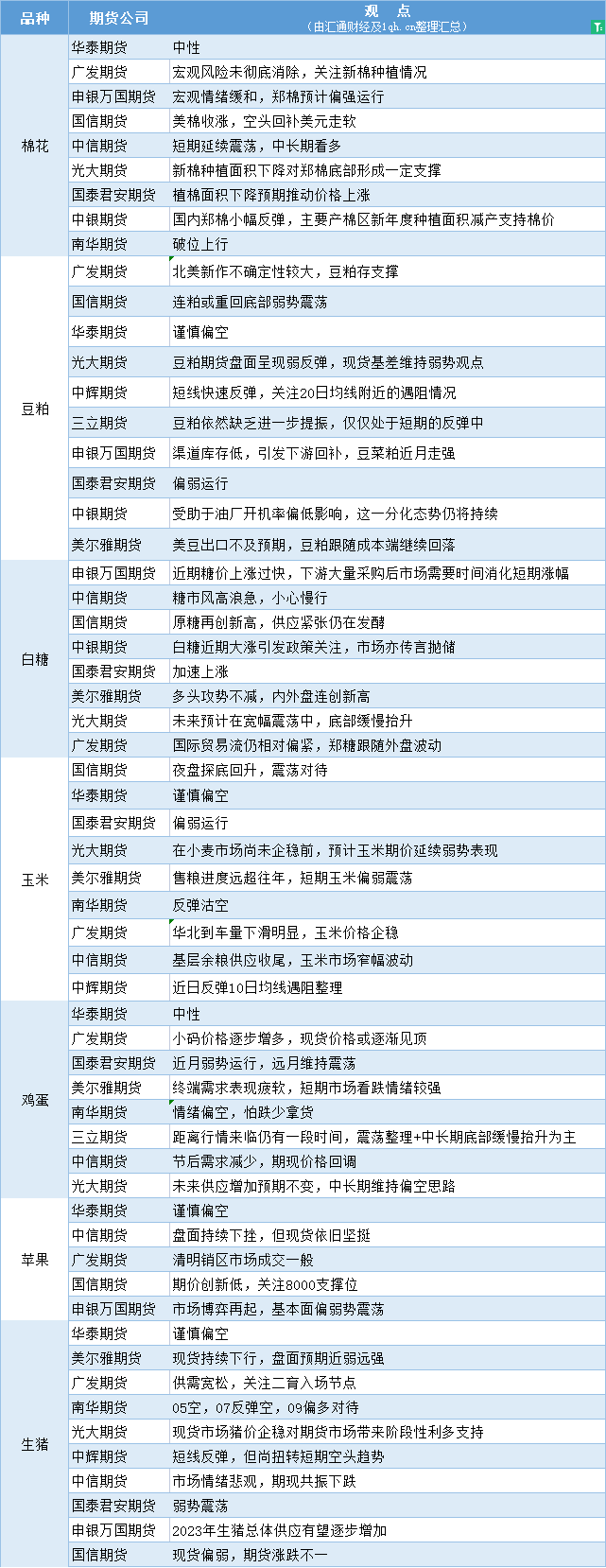 汇通财经APP讯——期货公司观点汇总一张图:4月7日农产品(棉花、豆粕、白糖、玉米、鸡蛋、生猪等)