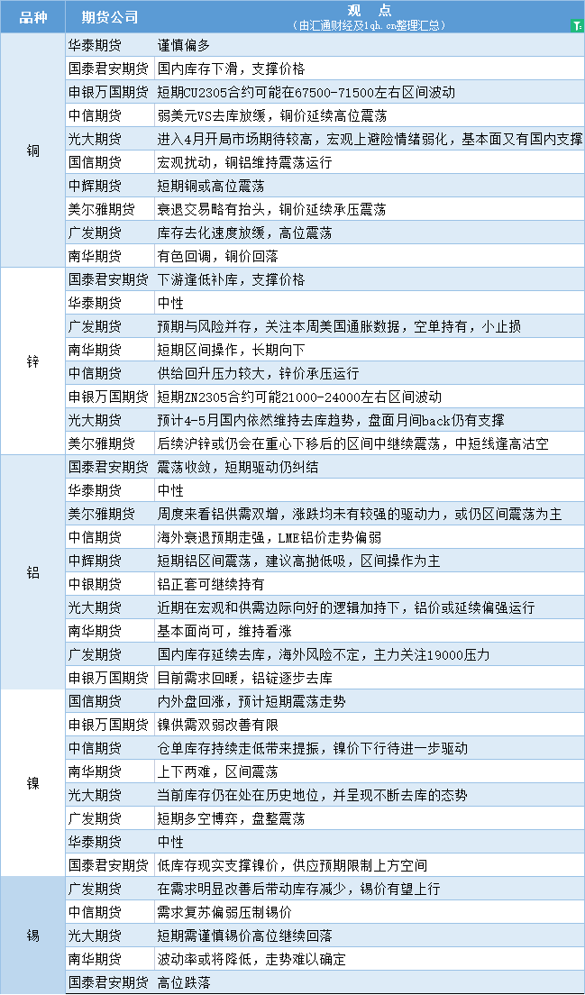汇通财经APP讯——期货公司观点汇总一张图:4月10日有色系(铜、锌、铝、镍、锡等)