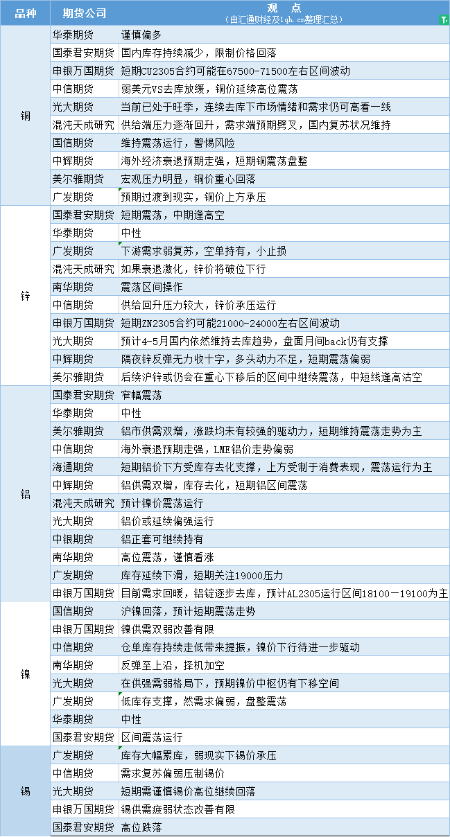 汇通财经APP讯——期货公司观点汇总一张图:4月11日有色系(铜、锌、铝、镍、锡等)