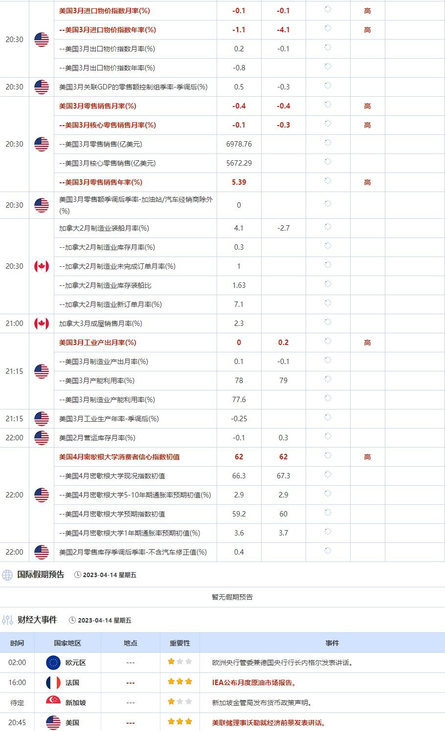 汇通财经APP讯——4月14日,投资者需要关注的重点数据:美国3月进口物价指数月率,美国3月进口物价指数年率,美国3月零售销售月率,美国3月零售销售年率,美国3月核心零售销售月率,美国3月工业产出月率,美国4月密歇根大学消费者信心指数初值。需要关注的大事件包括IEA公布月度原油市场报告,美联储理事沃勒就经济前景发表讲话。