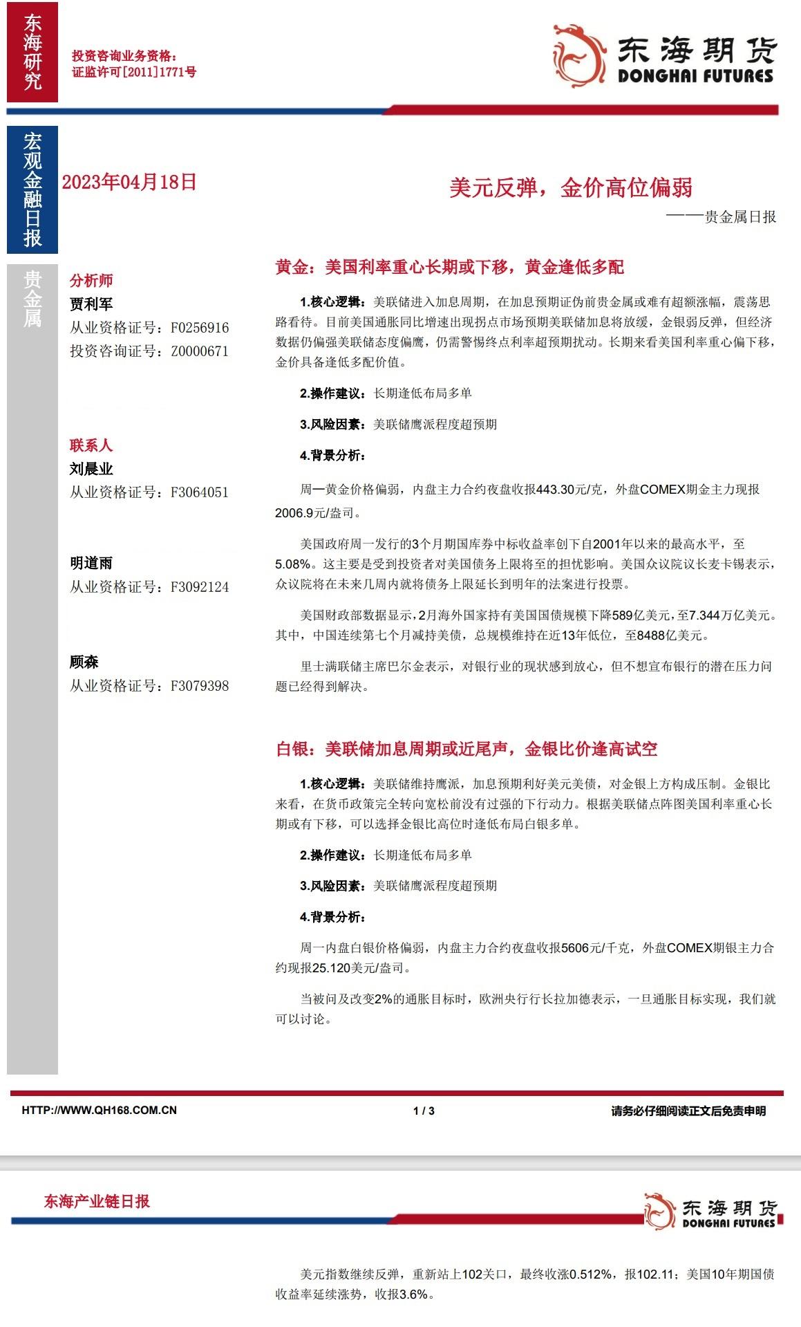 标题:【东海期货4月18日产业链日报】贵金属篇:美元反弹,金价高位偏弱