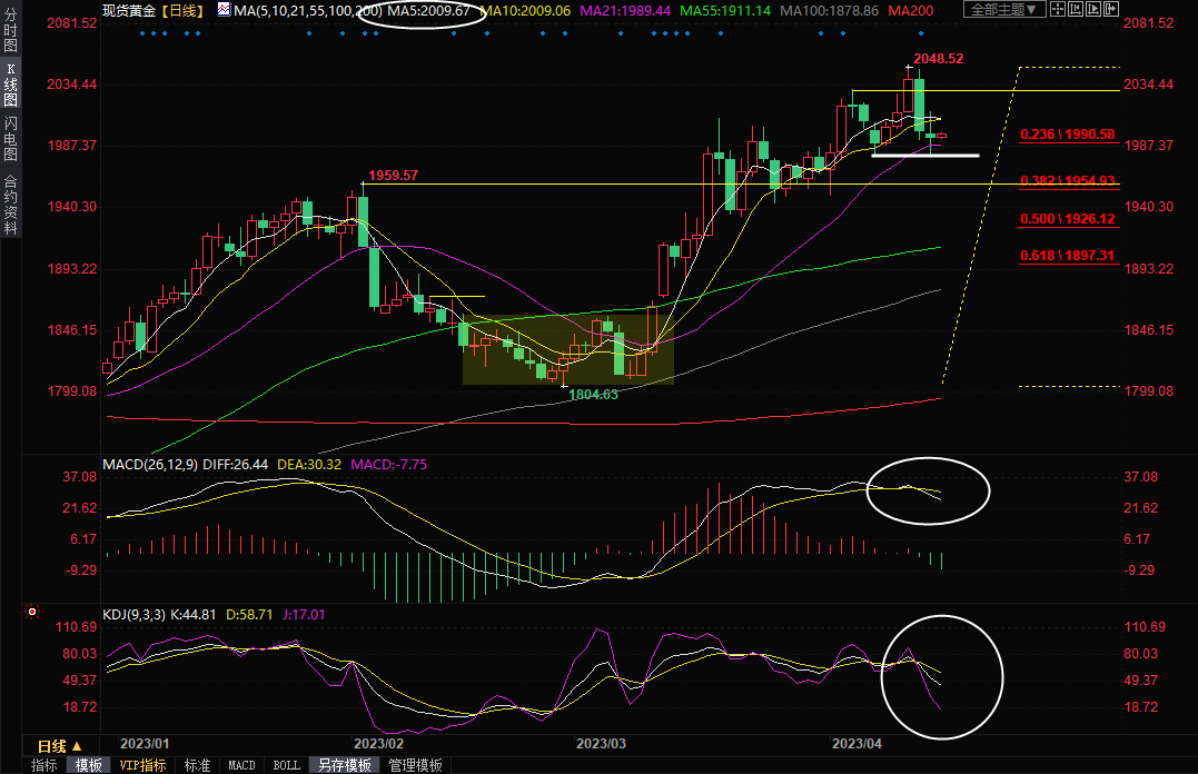 整体来看,虽然欧美银行业危机仍未完全消散,金价中线仍留有再度冲高的机会,但短线而言,市场对这种担忧情绪有所消退,而且美国经济数据仍相对强劲,市场强化了美联储5月份加息预期,美元持续反弹,美债收益率冲高,这对金价打压明显,金价技术面短线见顶信号持续,后市预计仍有进一步下行风险,留意1980关口附近支撑,若失守该支撑,则可能会进一步跌向1960关口、甚至是1950关口附近。上方初步阻力在5日均线2010关口附近,若能收盘于该位置上方,则削弱短线下行风险。北京时间09:50,