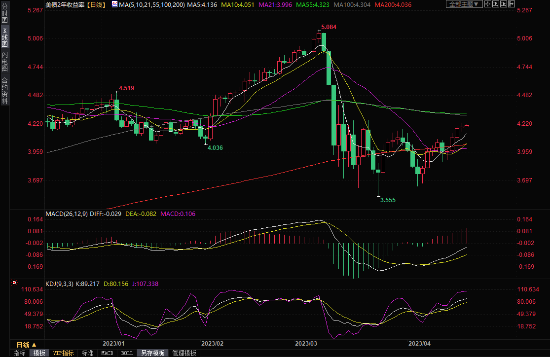 美国2年期国债收益率更加强势,周二微涨0.26%,为连续四个交易日收涨,盘中一度创近四周高点至4.231%,收报4.199%,周三亚市延续涨势,目前交投于4.213%附近;因美联储官员依然强调需要继续对抗通胀,即使市场消化今年晚些时候的降息押注,而且房地产市场数据企稳。