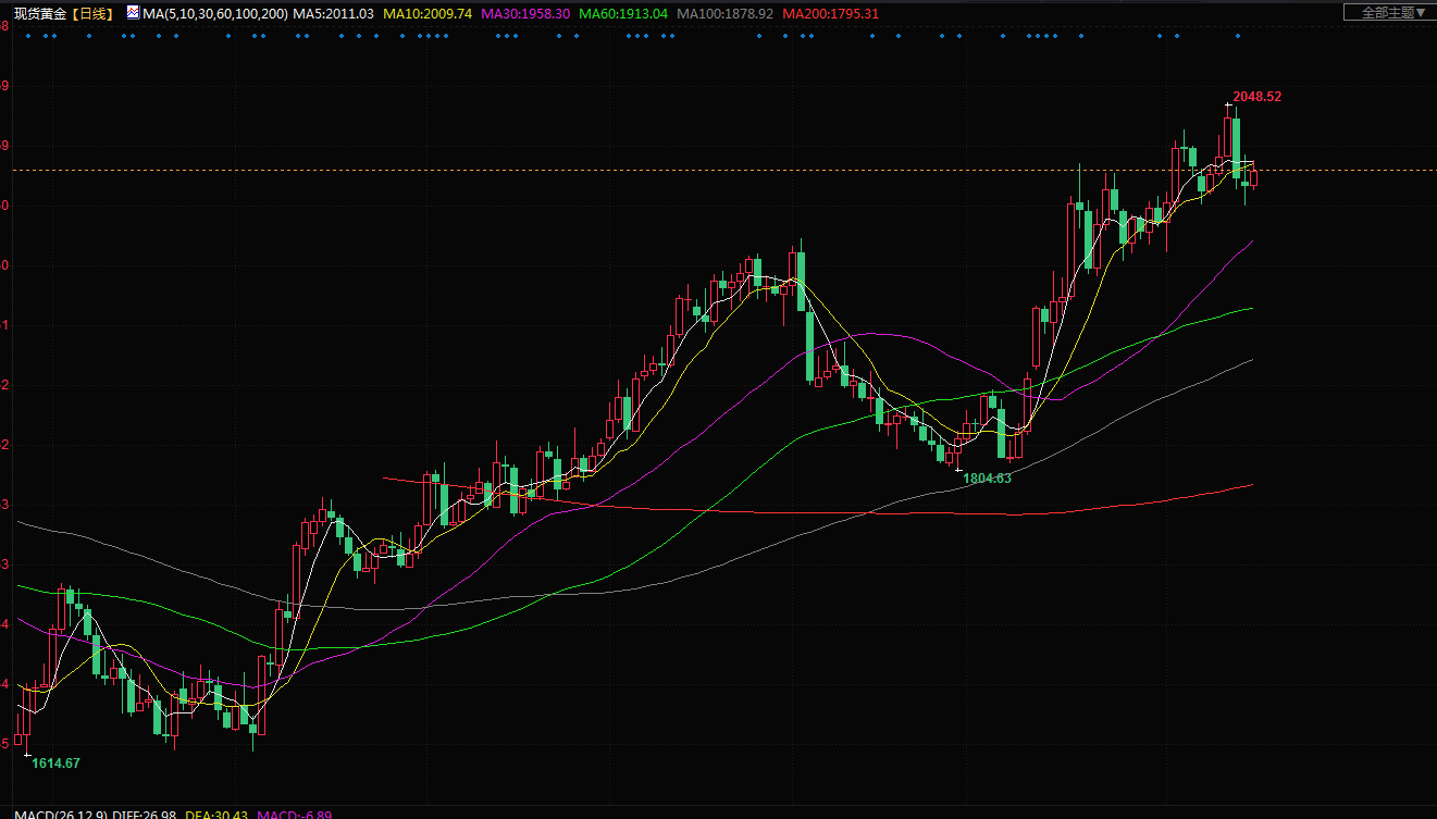 商品收盘情况:美国期金收高0.6%,报2019.70美元。