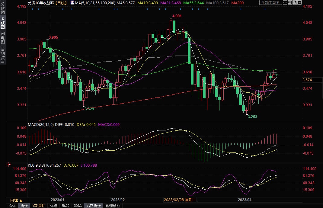 10年期美国国债收益率周三继续上涨,盘中一度创近四周高点至3.639%,但受到55日均线压制,收报3.602%,因为全球国债收益率被高于预期的英国通胀率带动上扬,而且投资者消化美联储可能继续加息的可能性。