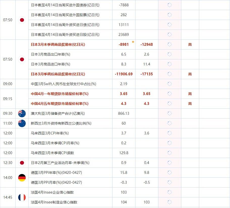 09:15 中国4月一年期贷款市场报价利率(%) , 前值 3.65 , 预期值 3.65 , 公布值:待发布