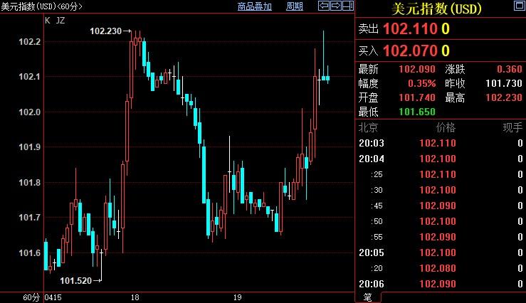 北京时间20:05,现货黄金下跌1.70%至1970.93美元/盎司;COMEX期金主力合约下跌1.83%至1982.8美元/盎司;美元指数上浮0.34%至102.089。