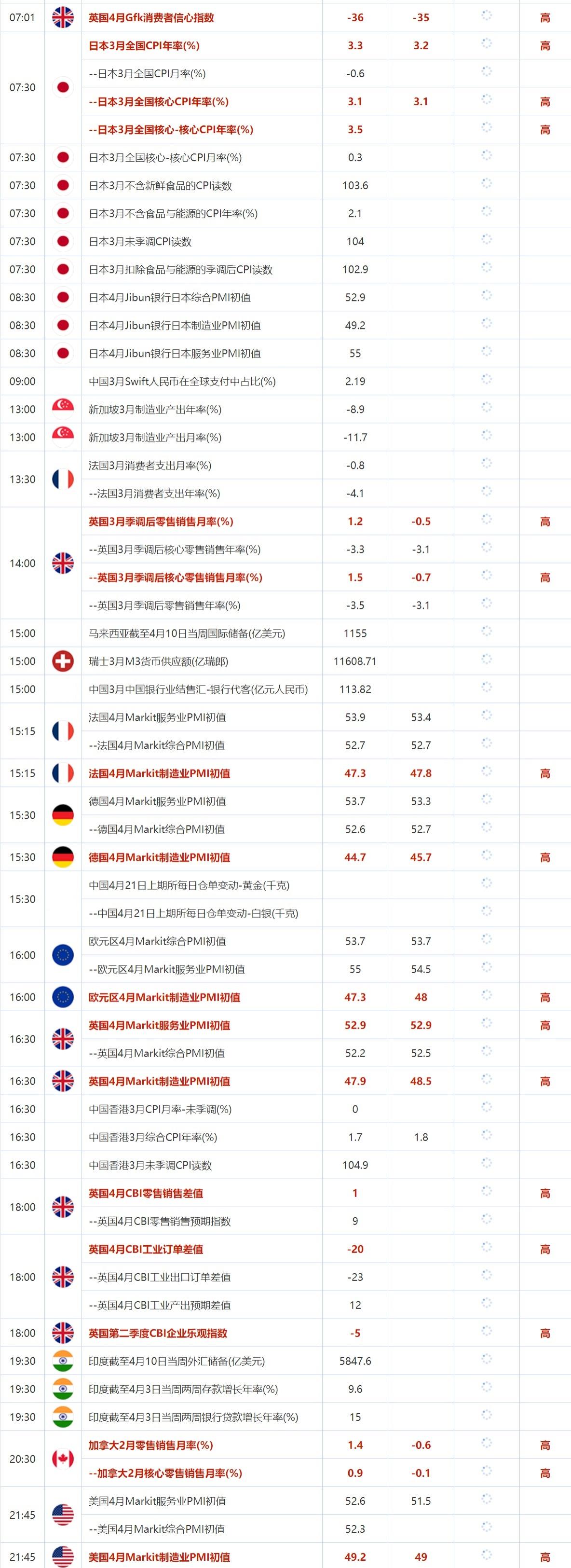 07:30 日本3月全国CPI年率(%) , 前值 3.3 , 预期值 3.2 , 公布值:待发布
