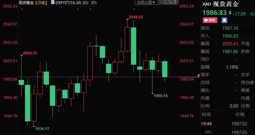现货黄金本周下跌0.57%至1988.85美元/盎司,