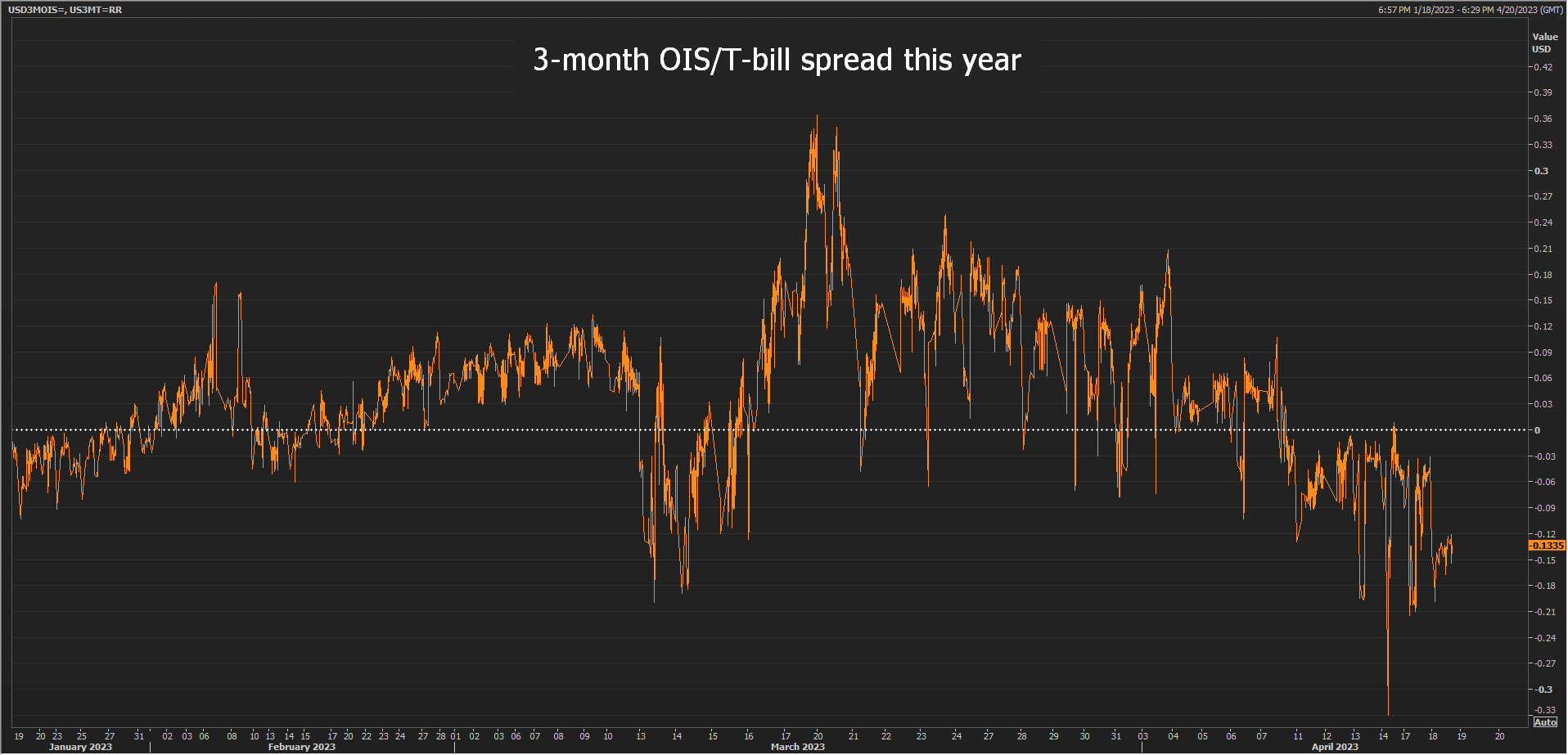 目前,三个月国库券收益率比三个月OIS高15个基点左右。上周该利差高达30个基点。