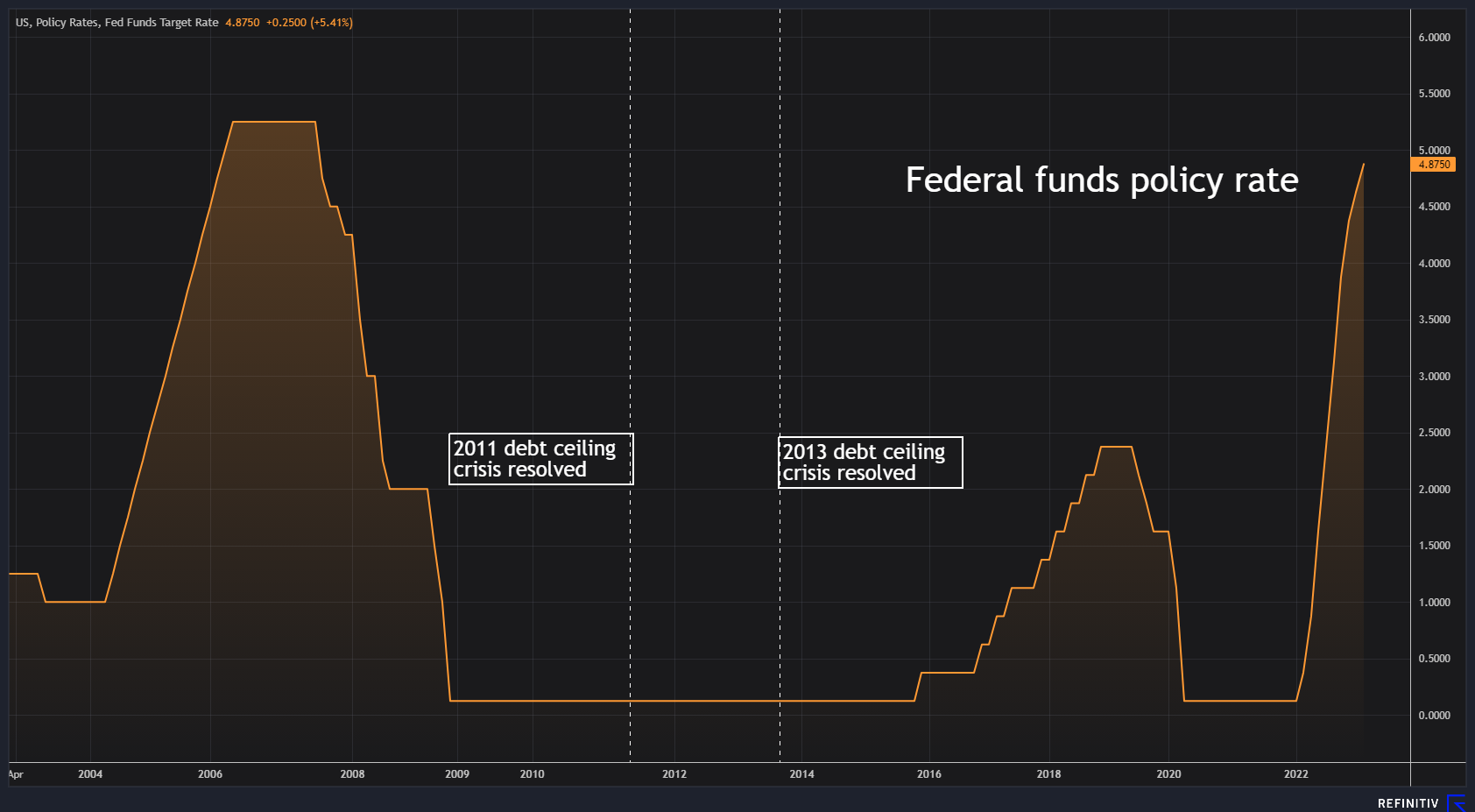 如果国会达不成协议,财政部到6月至10月的某个时点将会无钱可用,大约就在利率触及本轮加息周期峰值的同时或略晚一点。本轮加息周期的激进程度堪称40年来之最。