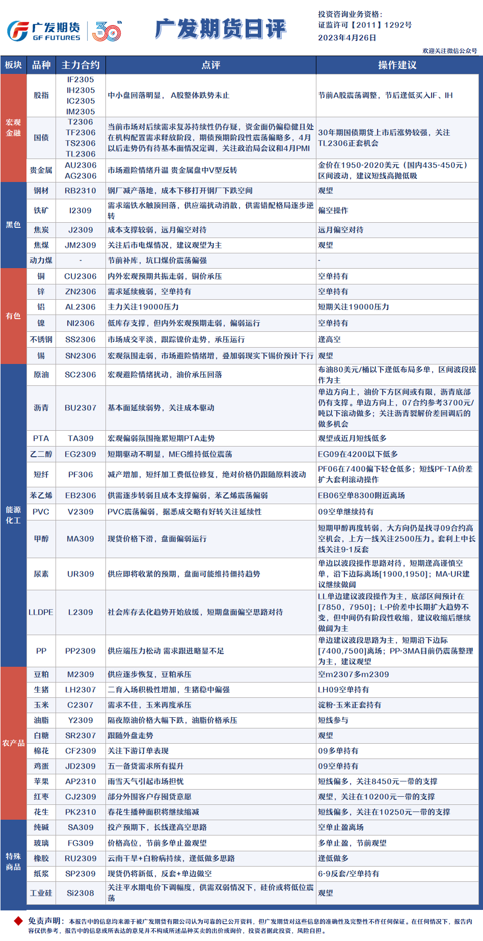 汇通财经APP讯——广发期货发布4月26日日评,金价在1950-2020美元区间波动,建议短线高抛低吸;铁矿偏空操作,焦炭远月偏空对待;铜和锌偏空对待;铝短期关注19000压力;布油80美元以下逢低布局多单,区间波段操作为主。