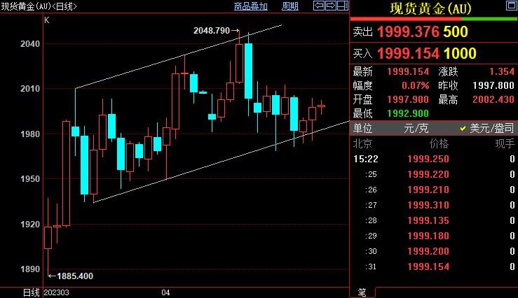 北京时间19:45,现货黄金下跌0.14%至1993.33美元/盎司;COMEX期金主力合约下跌0.07%至2003.3美元/盎司;美元指数下跌0.53%至101.341。