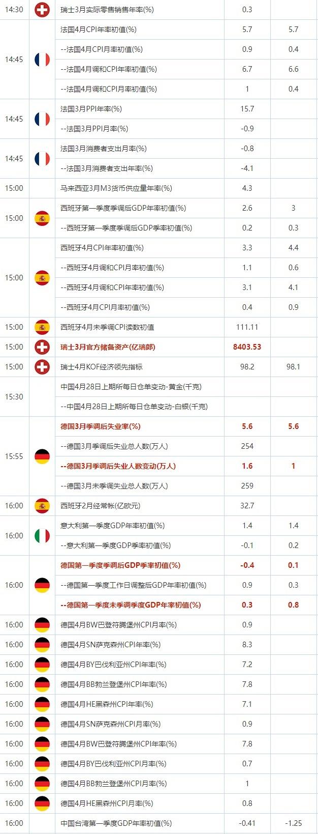15:00 西班牙4月CPI年率初值(%) , 前值 3.3 , 预期值 4.4 , 公布值:待发布