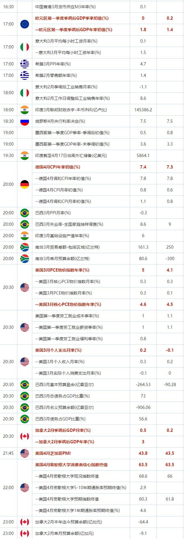 20:30 美国3月核心PCE物价指数年率(%) , 前值 4.6 , 预期值 4.5 , 公布值:待发布